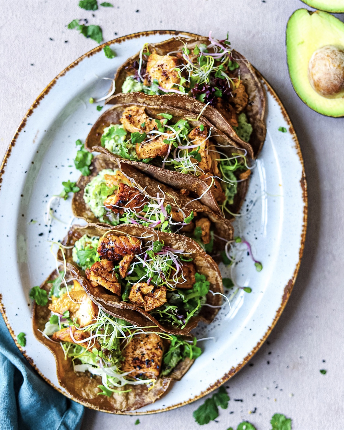 Blue Corn Tacos met avocadosaus en zalm met sumak