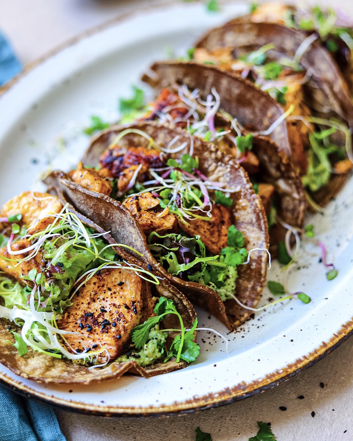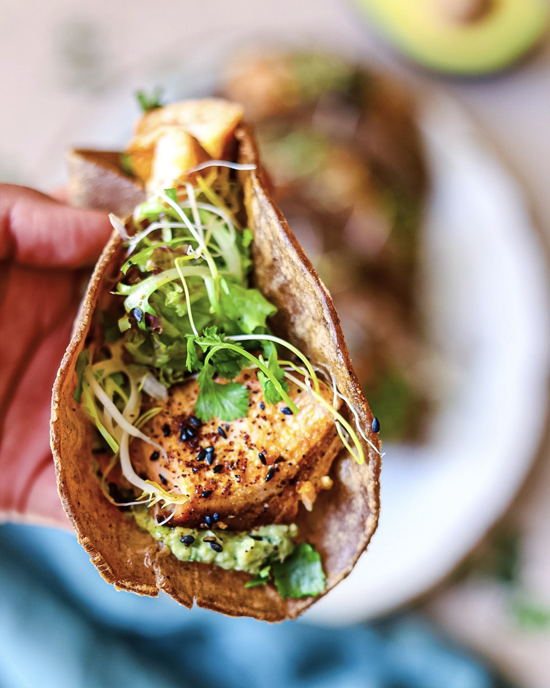 • Stel vervolgens de taco's samen door te beginnen met wat avocadosaus, gevolgd door een flinke hand sla, stukjes zalm en spruitjes. Bestrooi met wat verse koriander, sumak en zwarte sesamzaadjes.TIPS:- Voeg mango-stukjes toe voor een fruitige noot.- Maak een tacokom en serveer deze zalm met rijst, de avocadosaus, tomaat, mais, komkommer en sla.Als je mijn recepten maakt, tag me dan erin en gebruik #thespicedchickpearecipes. Ik zou graag zien wat je hebt gemaakt.