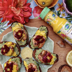 Crostini met Avo Smash, Gegrilde Garnalen & Mango-Kurkuma-Gembersaus