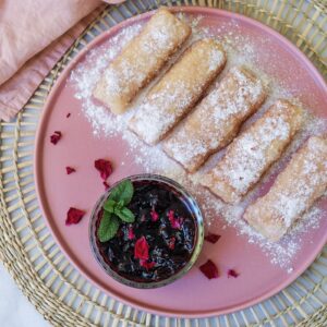 Rijstpudding + Rijstpapier + een kleine baksessie = een BOMB zoet dessert / snack! Sprenkel of verdrink je broodjes in poedersuiker en eet ze met mijn kersensaus. Het is zo lekker en verslavend om te eten. Probeer ze uit en laat me weten wat je ervan vindt!