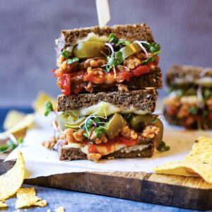 - Stel je toast samen door deze in lagen te leggen met de salsa, het vlees, de spruitjes / avocadoplakken en jalapeños. Leg de andere toast erop en halveer. Serveer met wat guacamole of mijn avocadosaus en geniet ervan!