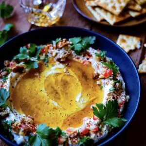 - Versier de randen met gemalen walnoten, granaatappelpitjes, chilivlokken en verse zwarte peper. Serveer met crackers, toast of flatbread. Genieten van!