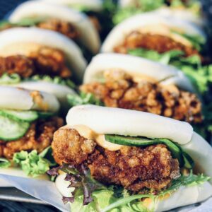 • Laat de kip op keukenpapier rusten en breng op smaak met de kruidenmix. Terwijl de kip wat afkoelt, doe je de Gua Bao in de magnetron om hem te laten stomen. Als ze gaar zijn, smeer je een laag Sriracho-mayonaise op de bodem van het broodje. Voeg de sla toe, leg er een krokant stukje kip op, voeg dan nog meer Sriracho mayo toe en werk af met een paar plakjes komkommer en geniet ervan! TIPS: - Maak een coole snack en verander deze kip in de beroemde Taiwanese Popcorn Kip door de dijen in blokjes kip te snijden. - Hou je niet van zachte Gua Bao's? Maak je geen zorgen, deze knapperige stukjes zijn ook heerlijk bij broodjes, op een stokbrood, in een wrap of over (plak) rijst! Als je mijn recepten maakt, tag me dan erin en gebruik #thespicedchickpearecipes. Ik zou graag zien wat je hebt gemaakt!