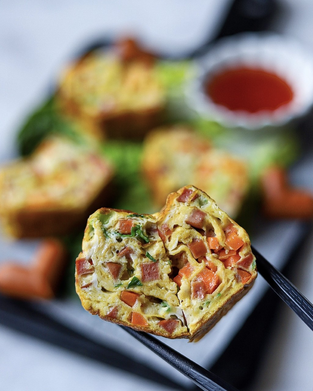 - Snijd vervolgens de Tamagoyaki in vier stukken en snijd elk stuk schuin. Verplaats de helften om een schattig hart te maken. Serveer met chili mayo of sojasaus en geniet ervan! TIP: - Als je vegetariër bent, kun je de worst vervangen door een veganistische variant of deze weglaten. Als je mijn recepten maakt, tag me dan erin en gebruik #thespicedchickpearecipes. Ik zou graag zien wat je hebt gemaakt!
