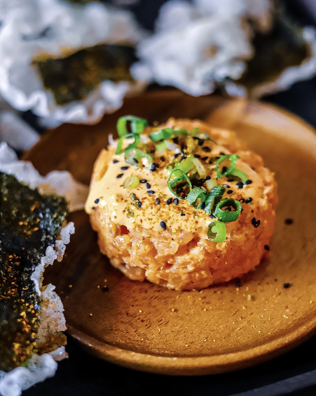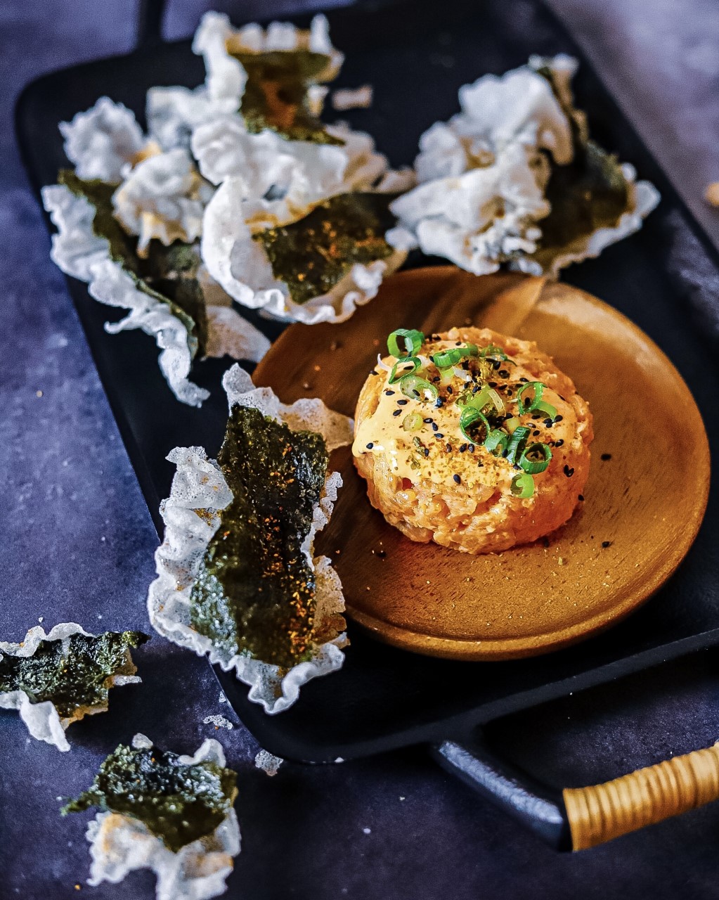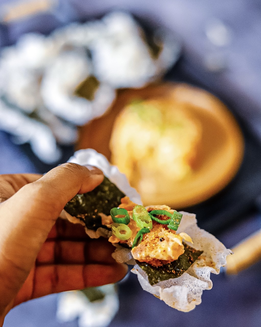 - Garneer met wat extra saus, Shichimi Togarashi (optioneel), fijngesneden bosui en zwarte sesamzaadjes. Serveer met mijn gebakken zeewierchips .
