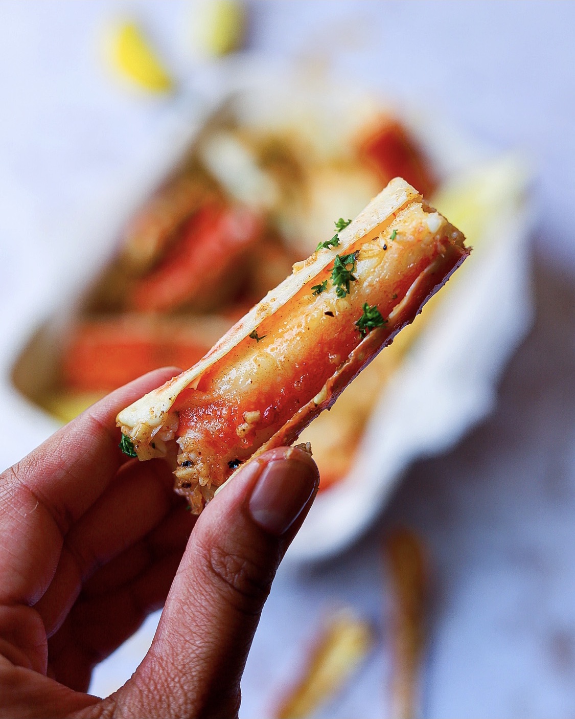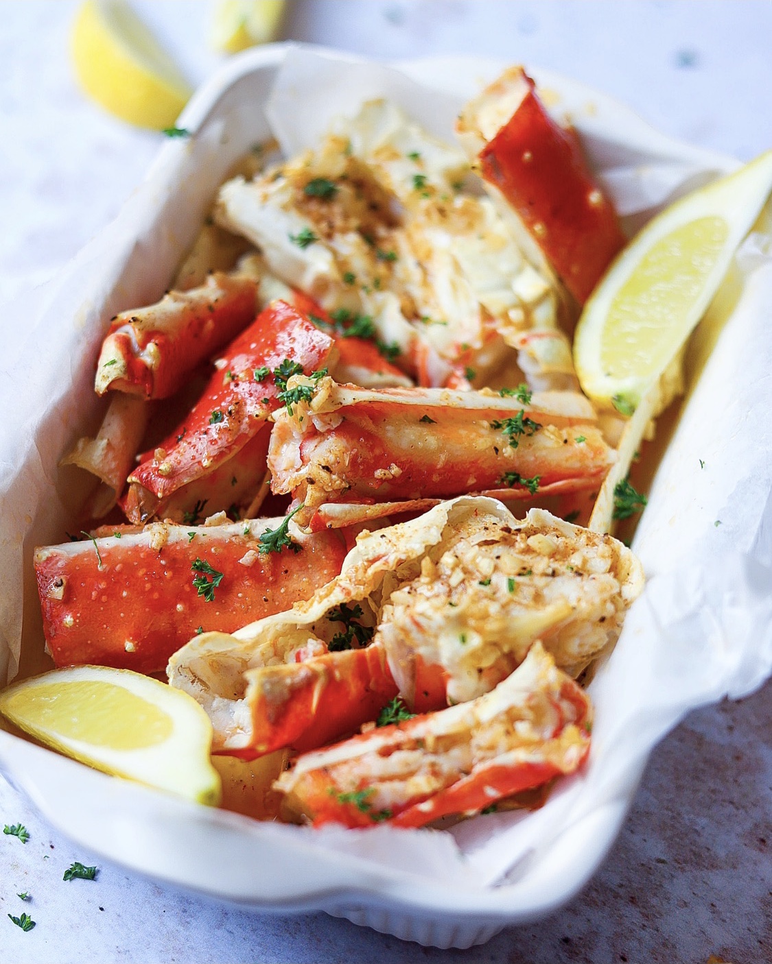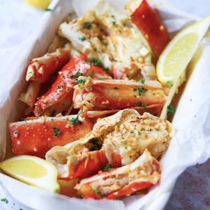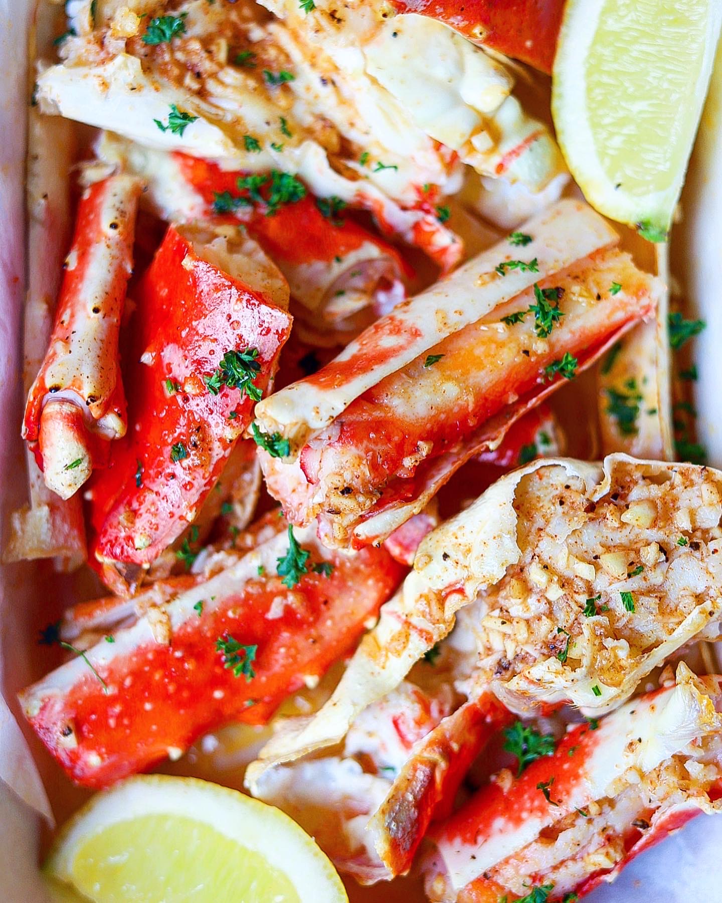 - Wanneer de King Crab volledig gebakken is, besprenkel of schep de boter over de stukjes en zorg ervoor dat deze in de schaal gaat. Garneer tot slot met peterselie, partjes citroen en geniet ervan!Als je mijn recepten maakt, tag me er dan in en gebruik #thespicedchickpearecipes. Ik zou graag willen zien wat je hebt gemaakt.