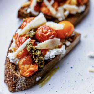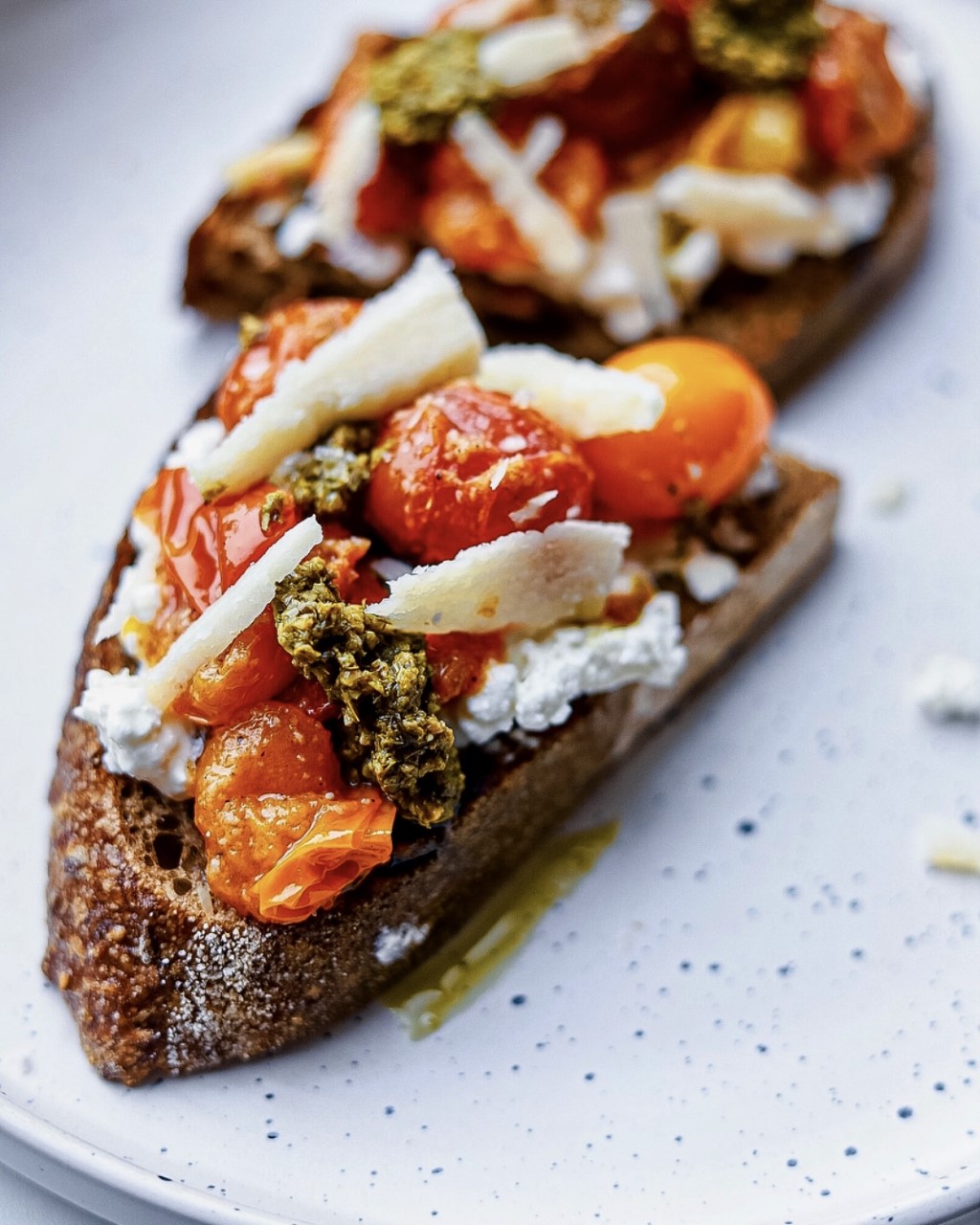 - Stel je toast samen en verdeel er wat Hüttenkäse over, gevolgd door de tomaten, een scheutje pesto en bestrooi met Parmezaanse kaas. Breng op smaak met peper & zout en geniet!Als je mijn recepten maakt, tag me er dan in en gebruik #thespicedchickpearecipes. Ik zou graag zien wat je hebt gemaakt
