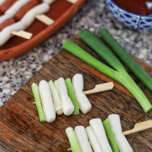 - Blancheer de rijststokjes een paar minuten in kokend water. Gooi ze dan door wat sesamolie om te voorkomen dat ze gaan plakken. Als je ze kunt pakken, rijg ze dan aan een spies, afwisselend worst of bosui.