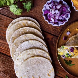 - Maal de maïs in een keukenmachine tot een meelachtige textuur. Passeer het witte maïsmeel door een zeef en bewaar 192 g fijn wit maïsmeel. Voeg in een diepe kom het fijne maïsmeel toe, inclusief 2 el grofgemalen maïs* (die uit de zeef kwam), water, patentbloem en olie.*Voor een authentieke textuur heb ik de grove korrels toegevoegd, maar dit is optioneel.Let op: heb je veel grove mais over, maal deze dan nog een keer en zeef.