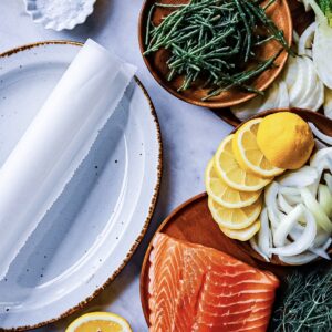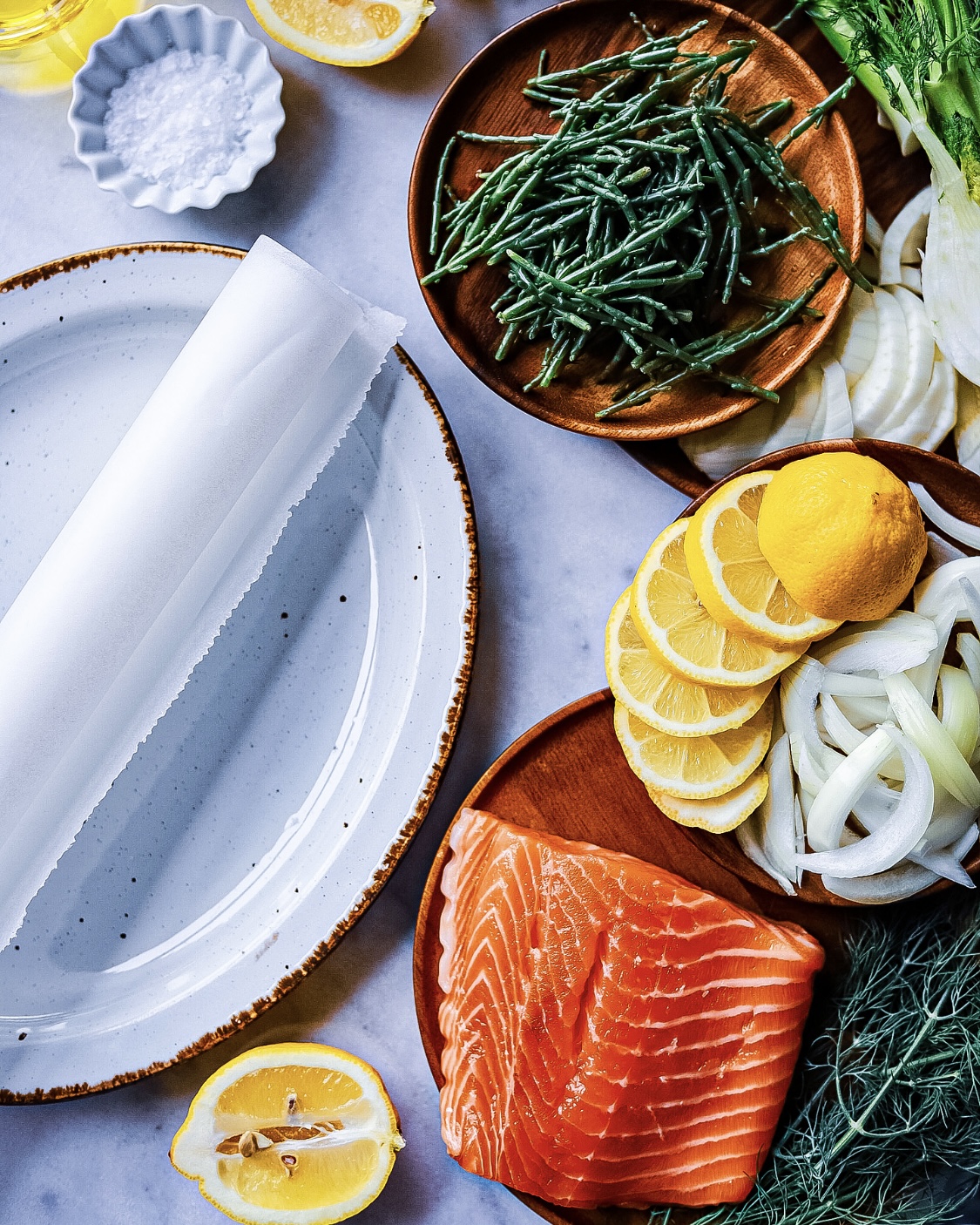 • Stel vervolgens je Zalm en Papillote samen door een handvol zeekraal op de bakplaat te leggen en daarna plakjes venkel. Leg de zalm erop, besprenkel met olijfolie, bestrooi met zeezout en zwarte peper.