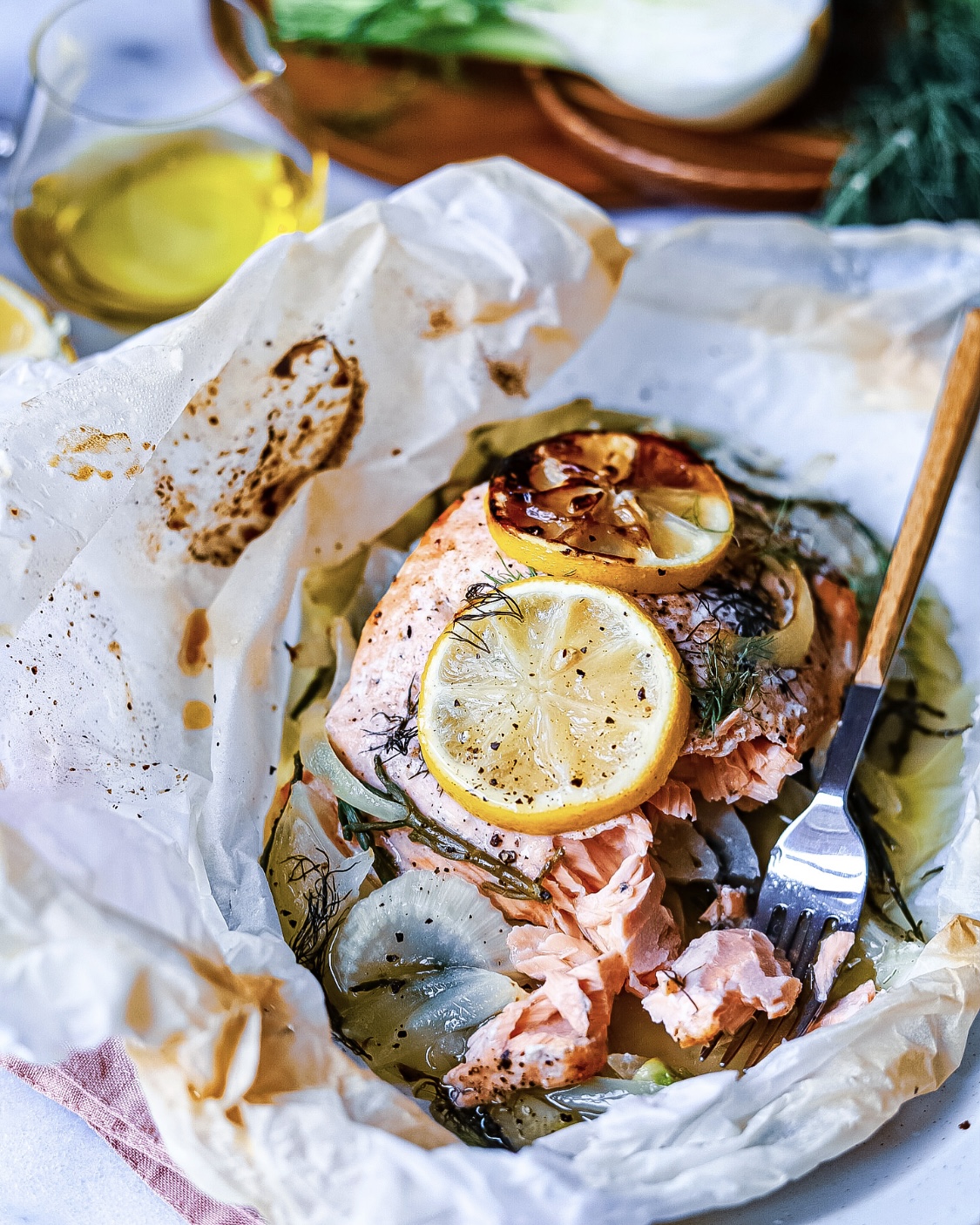 De eerste keer dat ik Salmon en Papillote at, schrok ik hoe weinig kruiden er werden gebruikt. Als Surinamer met Aziatische roots zijn onze kruidenkasten een horrorverhaal, want we hebben er zoveel! Maar door de jaren heen heb ik ook geleerd dat als je verse en goede producten gebruikt, de smaken er al zijn en je alleen een beetje zout, peper en wat citroensap nodig hebt. Nu hoor ik je zeggen, zus was niet allergisch voor citrus? Ja, dat ben ik helaas nog steeds, maar als het gekookt is, is het minder vervelend 😉