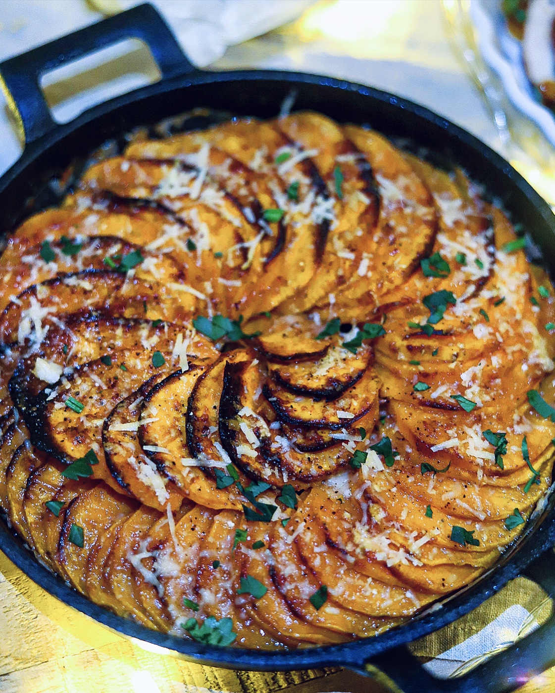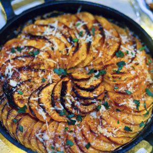 - Verwijder na 15-20 minuten de dunne folie en giet een mengsel van 1 eetlepel gesmolten boter, 1 eetlepel olijfolie, knoflookpoeder en Parmezaanse kaas over de galette. Zet het nog eens 5-7 minuten in de oven tot de zoete aardappelschijfjes gaar zijn en een mooie goudbruine kleur hebben.