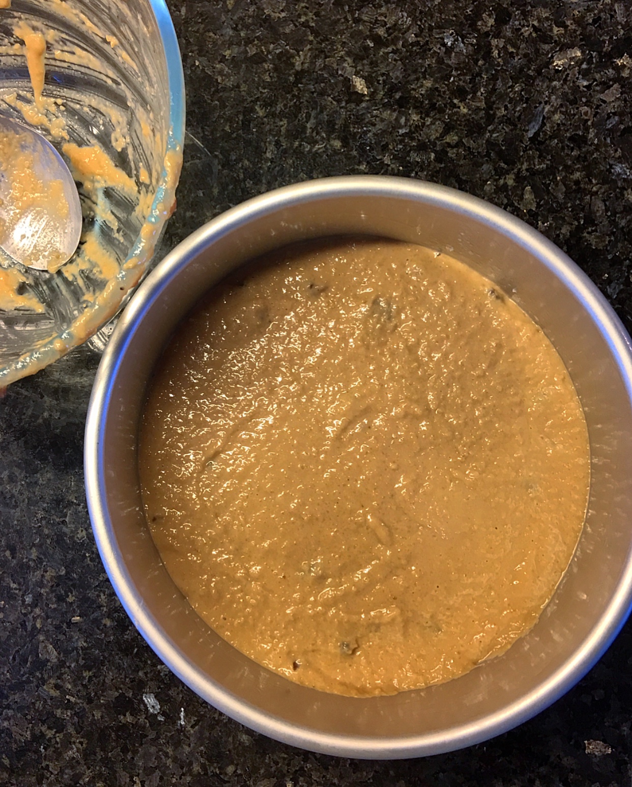 • Grease the cake pan with a tbsp of coconut oil and line the bottom of the pan with parchment paper.