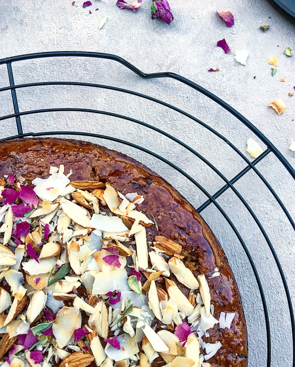 The cake isn’t actually entirely gluten-free, although you can substitute the all-purpose flour for a gluten-free variety or only use almond flour. This cake can be a bit more dense than a regular flour cake, however you can drizzle more syrup or add more coconut whip cream as a counterbalance. I also wanted to use less sugar in this cake so I used dates to add an extra note of sweetness and used coconut sugar instead of refined sugar. The coconut sugar adds a caramelly flavour to it, which we all enjoyed at home. You can also make a tiered cake and add the coconut whip cream in between the layers. Whichever way you eat this cake, I hope you enjoy it a lot!