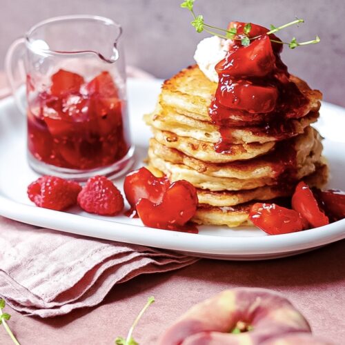 Cottage Cheese Pancakes w/ Peach & Raspberry Compote