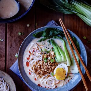 - When you’ve prepped all your ingredients it’s time to assemble the Tantanmen Ramen Add 1 tbsp or 2 (depending on sesame and spicy you like it) to a bowl and pour a ¼ cup broth on it. Stir well and then add your noodles and steamed baby bok choy to the bowl. Then pour more broth and garnish with a soft boiled egg, spring onions, black sesame seeds and a drizzle of chilli oil (optional).If you make my recipes please tag me in them and use #thespicedchickpearecipes. I'd love to see what you've made