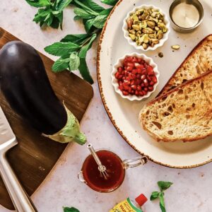 - Cut the eggplant and fry the pieces in ¼ cup sunflower oil on medium heat until golden brown on both sides. Keep an eye on the eggplant pieces and remove them after 7-10 minutes with a slotted spoon. Place the pieces on kitchen towel paper to release some of the excess oil 2. In a bowl prepare the dressing and mix well. 3. Place the fried eggplant pieces on a plate and sprinkle on the dressing. Then garnish with pomegranate seeds, pistachios, and mint leaves. Serve on toast, as a side, in a salad or in a wrap and enjoy!