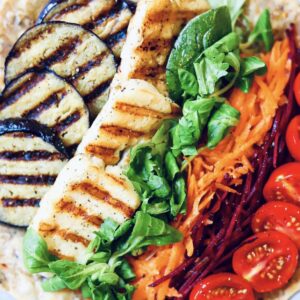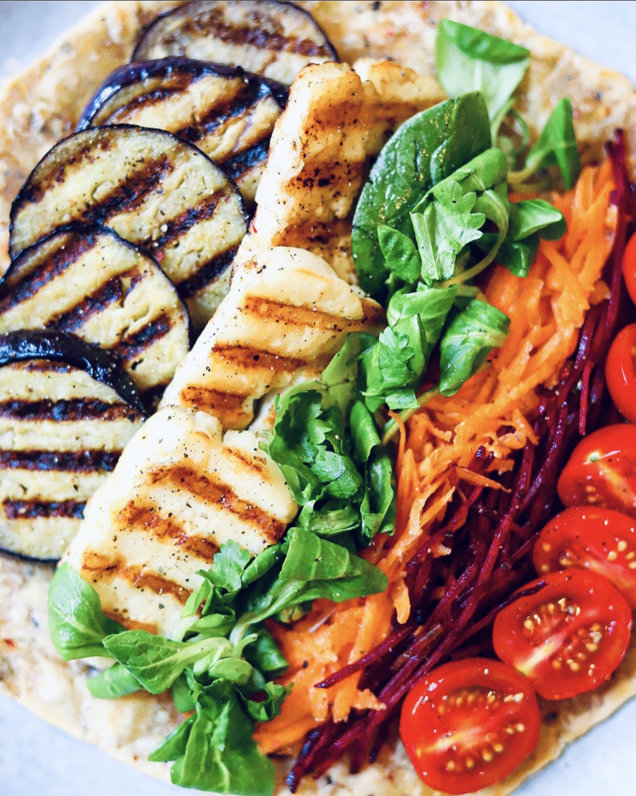 - In the meantime grill your eggplant and Halloumi cheese. Set these aside. Then assemble your wrap by adding a smear of hummus / yoghurt harissa and then add your eggplant, Halloumi slices, carrots, beets, tomatoes, lettuce leaves and fresh coriander. Roll it up and serve immediately! TIP: - Place the wrap on some baking sheet paper and roll it up. The sheet keeps the roll in shape, your wrap stays fresh and it’s easy to bring to work. - Use leftover vegetables or meat in this wrap. - Add tofu, tempeh or soy to veganize this wrap. If you make my recipes please tag me in them and use #thespicedchickpearecipes. I'd love to see what you've made!