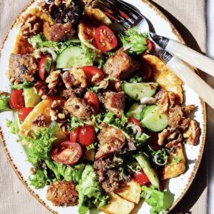 • Toss your sliced cherry tomatoes, cucumber, shallot in a bowl and season with 2 tbsp olive oil, Zaatar and add salt & pepper to taste. Finally mix the lettuce leaves in.