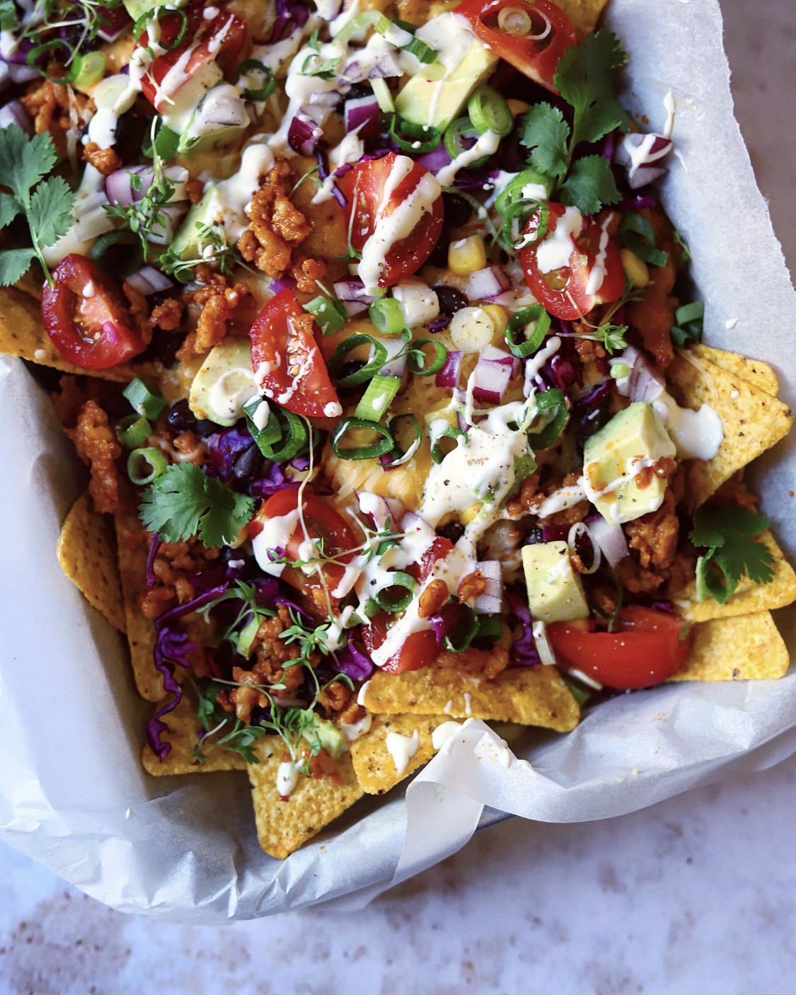 If you’re having a fiesta or just want a quick and tasty meal, then these nachos will not disappoint! The chicken mince is seasoned with a delicious and fragrant Thai red curry paste and cooked until crispy. Then we heat up the nachos and load it with the mandatory Mexican ingredients such as, corn, black beans, queso fresco (white cheese), tomato, avocado and sour cream. For color I add some red cabbage and sprouts, but this is optional. I was really happy with these flavors and hope you too.