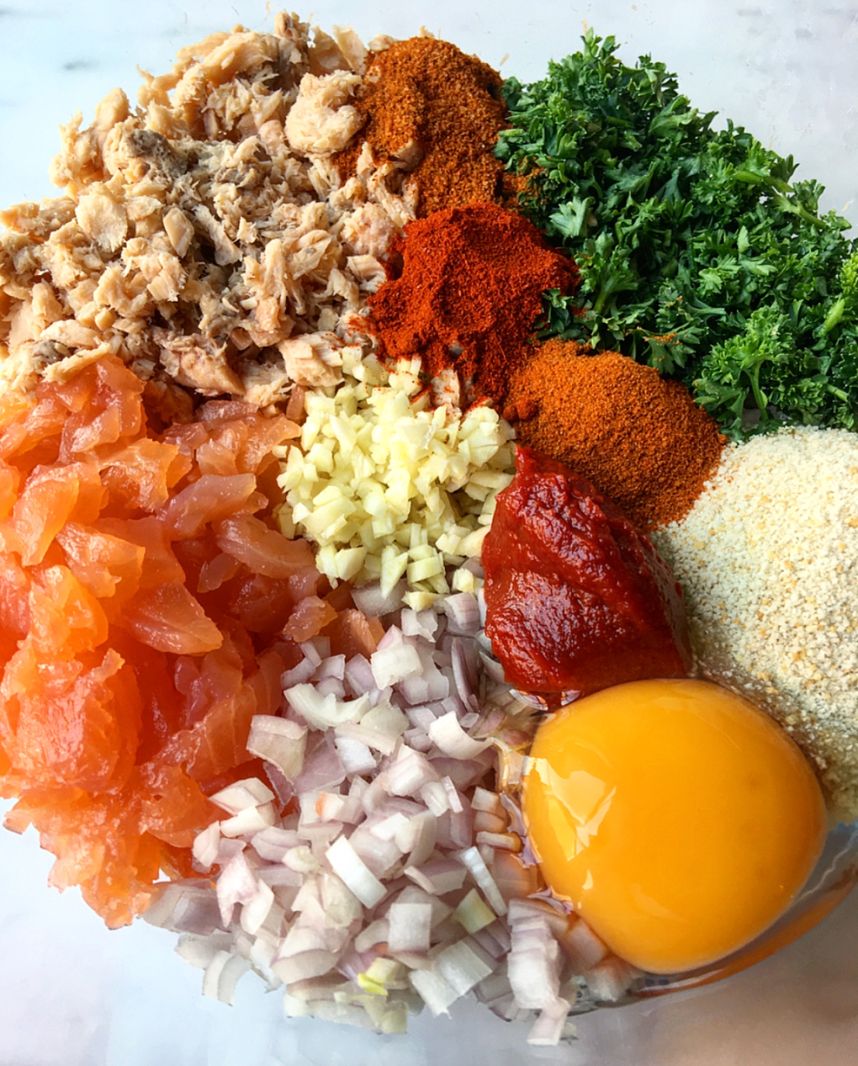 - Remove the salmon from the can. Clean it by removing the skin and bones. Then put all the ingredients for the salmon meatballs in a bowl and mix well. Coat your hands with a bit of oil and make firm meatballs. Place them on a baking sheet and brush them lightly with some oil. Bake the salmon meatballs for 10-15 minutes (depending on how hot your oven is) and turn them half way. NOTE: whisk the eggs and add 1 1/2 egg first. If the mixture still looks a bit dry add the remainder of the egg. You should be able to spread out the batter (see photo above).OPTIONAL: after 10 min baking time, I made a mixture of 1 tbsp of olive oil, ½ tsp Pimenton and 1 tbsp of tomato paste and gave the salmon meatballs a rub. They will look more like actual meatballs now. Pop them in the oven for an extra 2 minutes.