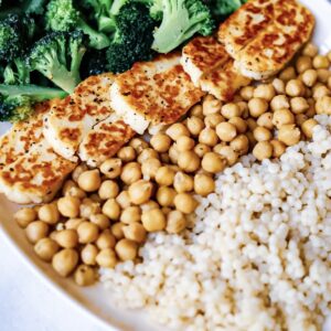 - 225 gr or one package of Halloumi seasoned with ½ tsp onion and garlic powder and 1 tbsp olive oil