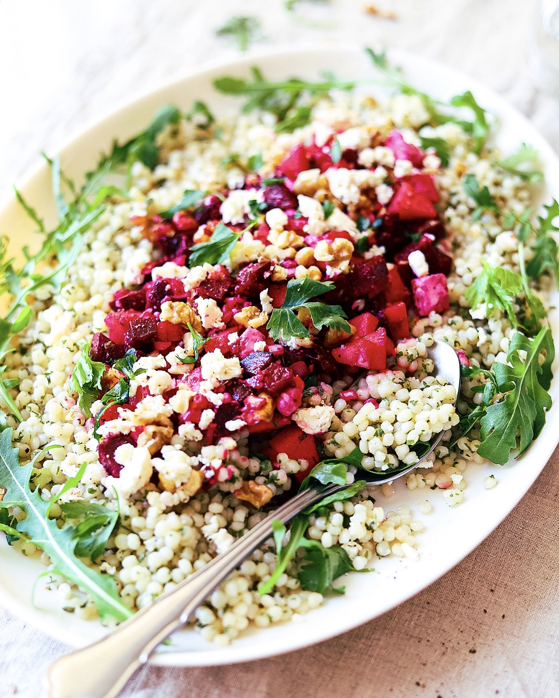- I served this Beet Salad on top of the Pearl Couscous and tossed that on a plate with some green leaves (seasoned with olive oil, salt & pepper). Have it with my Vegan "Steak" or enjoy it with a store-bought vegan burger.