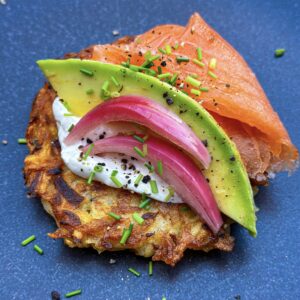 Potato Latkes w/ Sour Cream, Smoked Salmon & Avocado