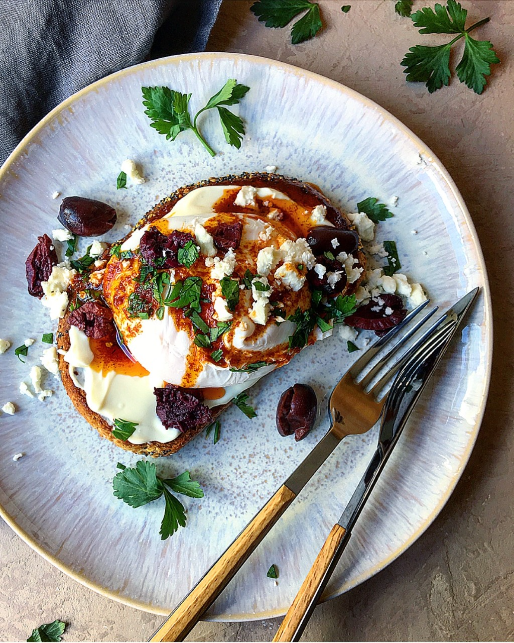 - Smear a layer of Greek yoghurt on the toast. Then top it off with the poached or soft-boiled egg. Then drizzle the hot flavoured buttery oil and garnish with some fresh parsley, olives, feta cheese and chili flakes. Enjoy!