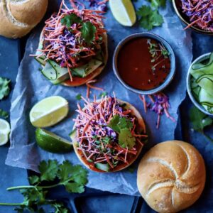 The ready-made curry pastes from So Thai, ensures that this dinner is on the table under 30 minutes. The curry pastes are packed with flavor and warm spices. All you have to do, is marinade the chicken mince, form patties and cook the meat. In the meantime, there’s enough time to make a quick coleslaw with the coconut cream and toast your buns.