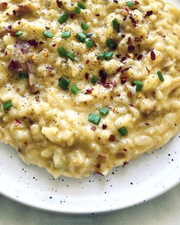 Is there anything comforting than eating a delicious Italian style meal with rice, Parmesan cheese and savoury bacon? Yes! Am talking about Carbonaraaa! But this time with a twist, because I’m making a risotto and swapping the bacon with a Turkey substitute. Not entirely authentic, but I promise you it will be equally delicious!