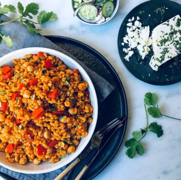 My Bulgur (wheat) recipe is one that I often make when I need a healthy and nutritious replacement for rice. This recipe is made with tomatoes, packed with spices, crunchy bell pepper and chickpeas and finely sprinkled with some feta cheese. Wheat might just have a winner here 😉